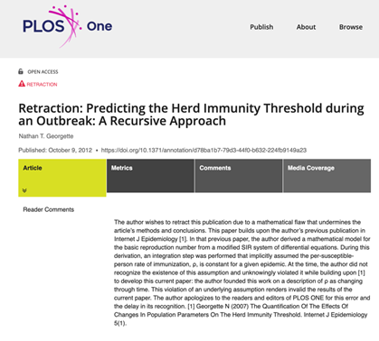 面对这一问题,Georgette本可以选择沉默,但他并没有这样做,而是主动联系期刊,请求撤稿。2012年,PLOS ONE发布撤稿声明,理由是“数学缺陷削弱了文章的方法和结论”。
