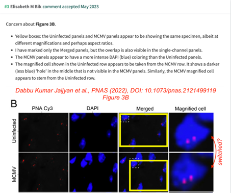 2023年5月,知名学术打假专家Elisabeth Bik在PubPeer上发出质询,指出文章中一组图片中有两张“似乎展示了同一个样品”。