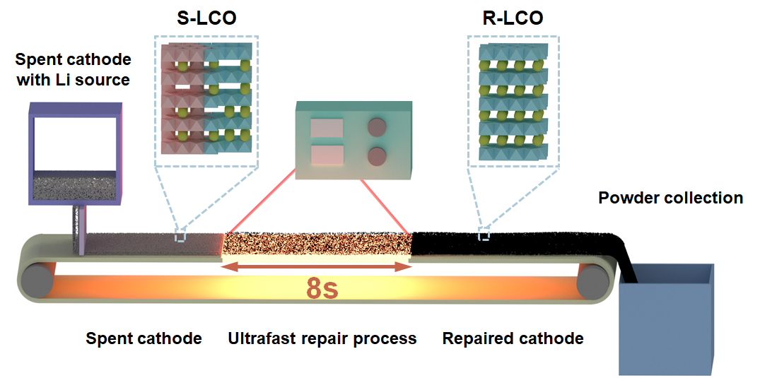 图5. 通过超快修复方法对正极材料进行大规模修复的示意图。
