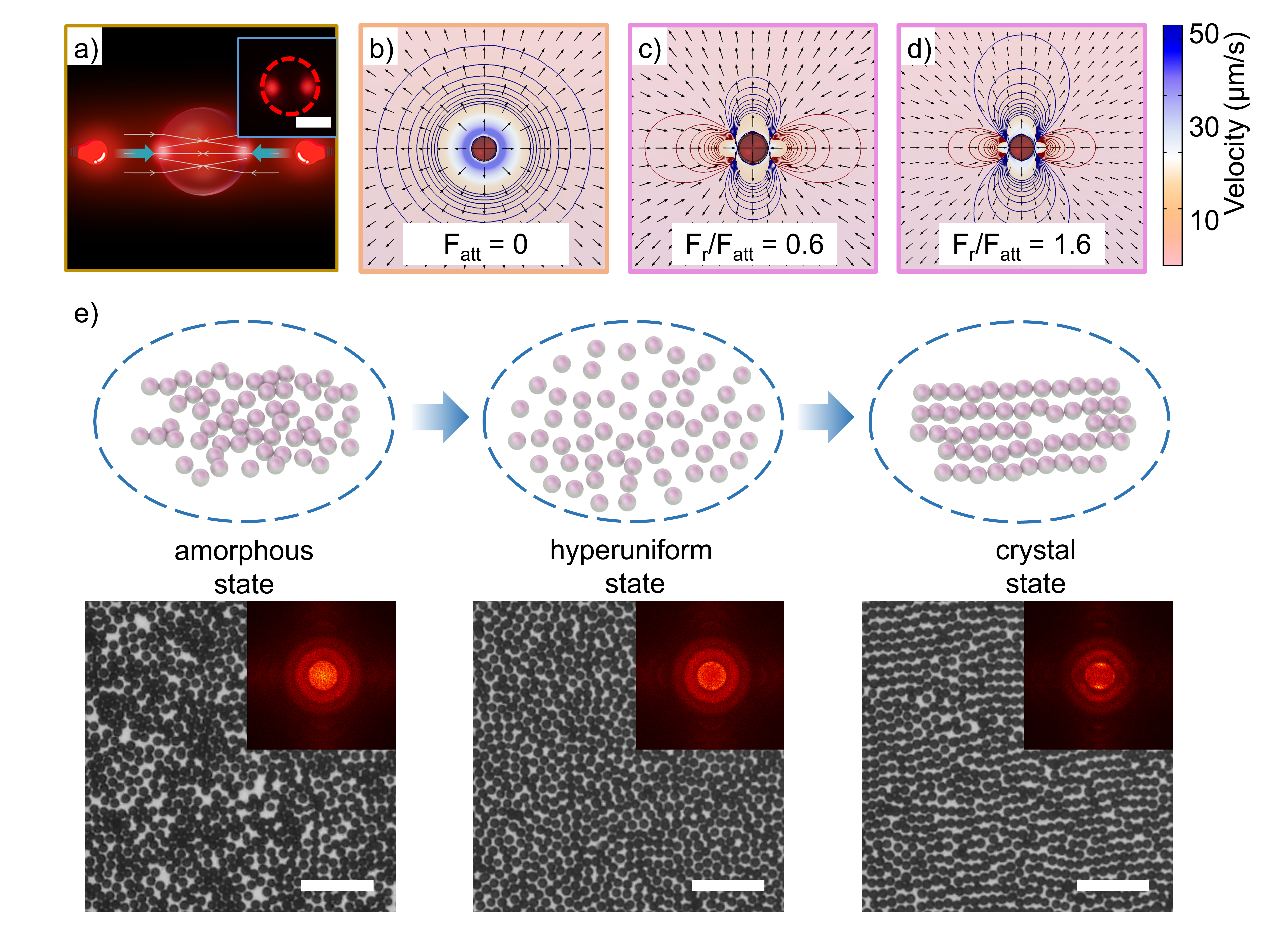 图2:利用双侧红光照射以及顶部蓝光照射在粒子周围构建出不同的流场,通过调节两种光的比例,能调节吸引力和排斥力的大小,实现不同的粒子排布。