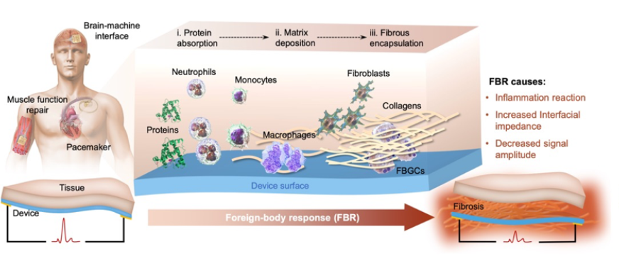 图1:可植入器件引发的异物反应(FBR)过程及其负面影响。
