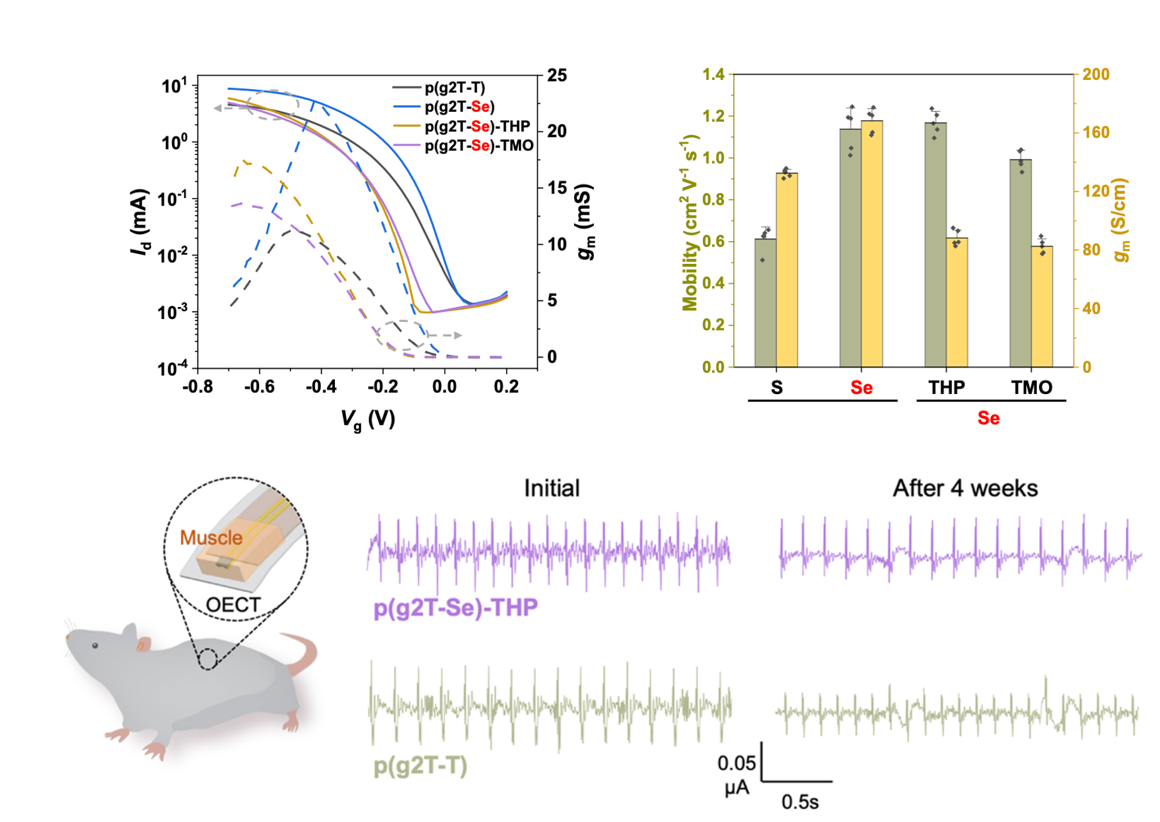 这些新型半导体材料在保持优异免疫兼容性的同时,其电学性能同样表现突出。与传统噻吩骨架相比,硒代噻吩主链不仅使电荷迁移率提升至1.2 cm2V-1s-1,还表现出更高的晶体管跨导值,充分证明了含硒骨架工程的独特优势。为验证材料的长期稳定性,项目进行了为期三个月的植入实验。结果显示,器件电流保持率始终维持在较高水平,证实了其出色的长期工作性能。更令人振奋的是,基于该材料开发的柔性OECT器件在小鼠体内成功实现了心电图(ECG)和肌电图(EMG)信号的长期监测(图4)。植入四周后,采用免疫兼容设计的器件仍能保持显著更高的信号质量,这一突破性进展为开发长期稳定的植入式医疗器件提供了重要技术支撑。