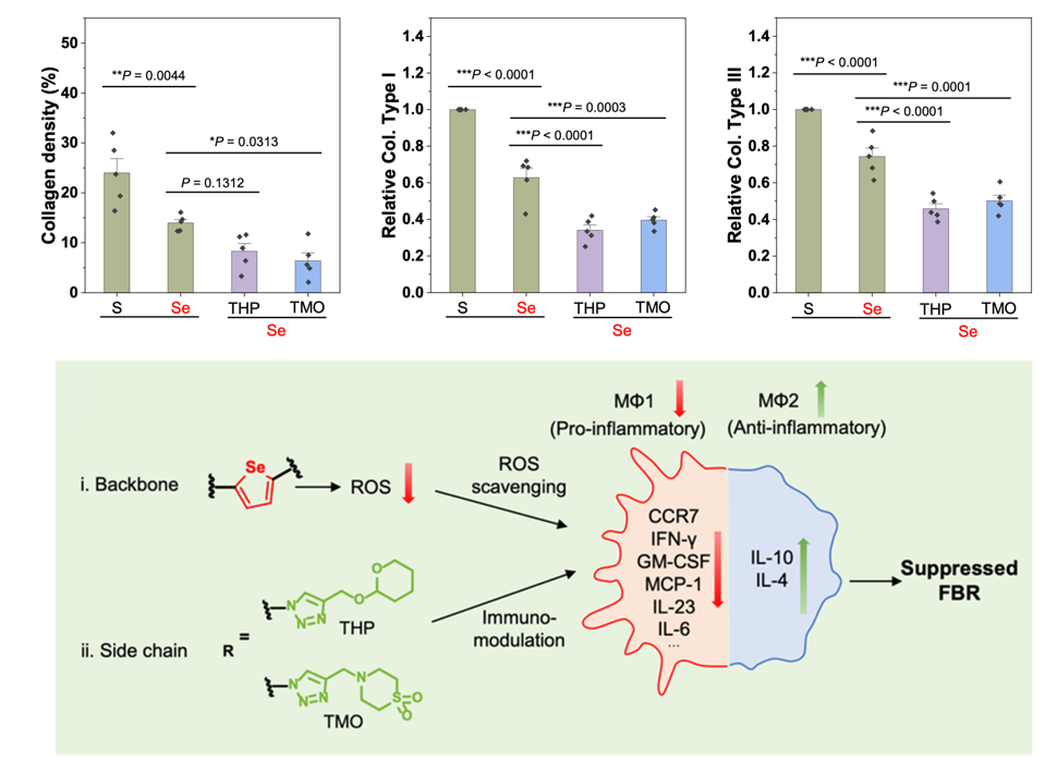 图3:免疫兼容性设计减少高分子薄膜上的胶原沉积(上)与免疫兼容半导体聚合物的免疫调节机制(下)。