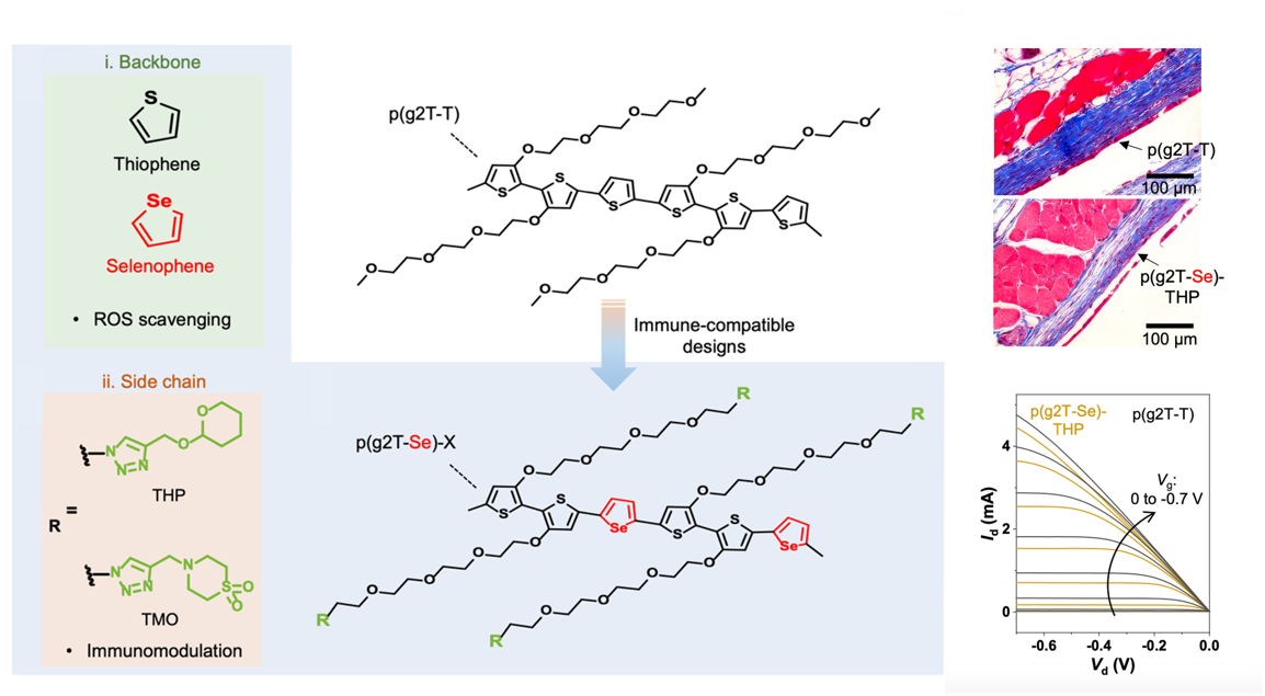 图2:具有抑制FBR功能的免疫兼容半导体聚合物设计:主链结构设计与侧链功能化策略(左);聚合物植入物的染色与OECT性能(右)。