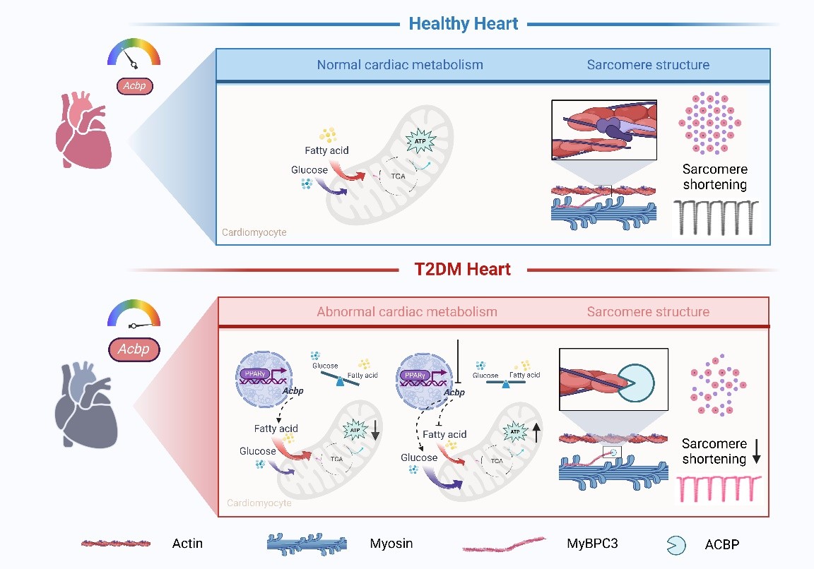 T2DM心脏中ACBP表达上调,加剧脂肪酸代谢紊乱,导致心肌底物代谢灵活性失衡,ATP生成效率降低,心功能受损。同时,过量的ACBP与肌节蛋白MyBPC3结合,阻止横桥结构的形成,导致心肌收缩力降低。心肌细胞表现出肌丝稀疏和肌节缩短降低。研究团队供图