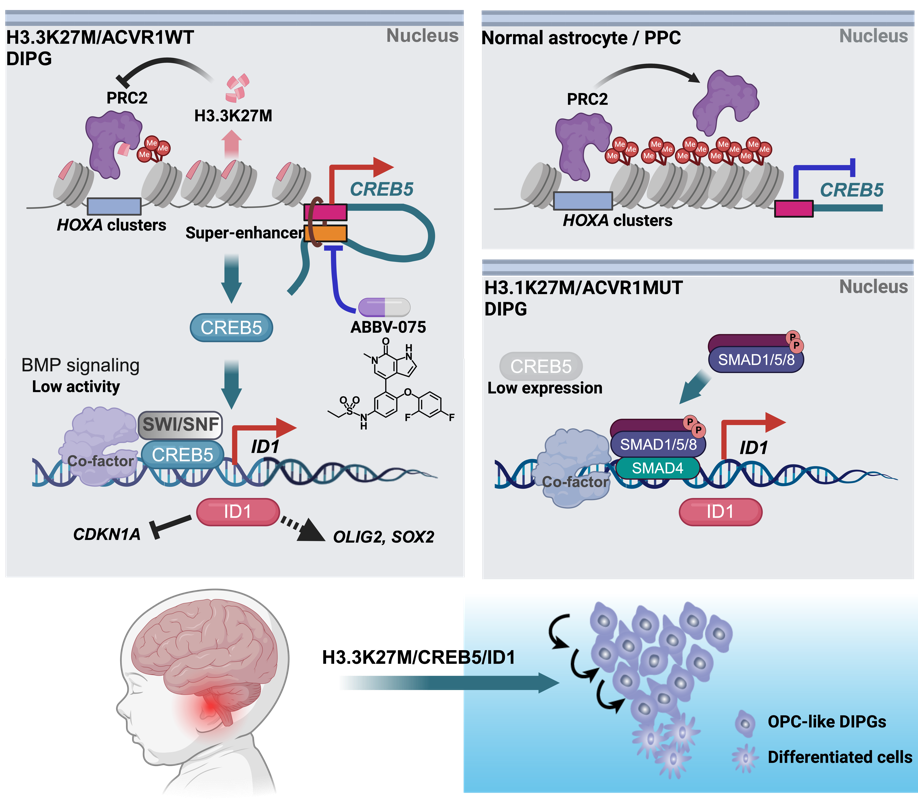 进一步分析发现,CREB5在正常发育小鼠脑桥区表达极低,其表达受到HOXA基因簇引导的H3K27me3沉默调控。而在H3.3K27M突变的DIPG细胞中,PRC2功能受抑,CREB5所在区域的H3K27me3水平下降,导致其异常激活。此外,CREB5还可与染色质重塑复合物SWI/SNF的核心亚基BRG1协同,激活下游恶性转录程序。