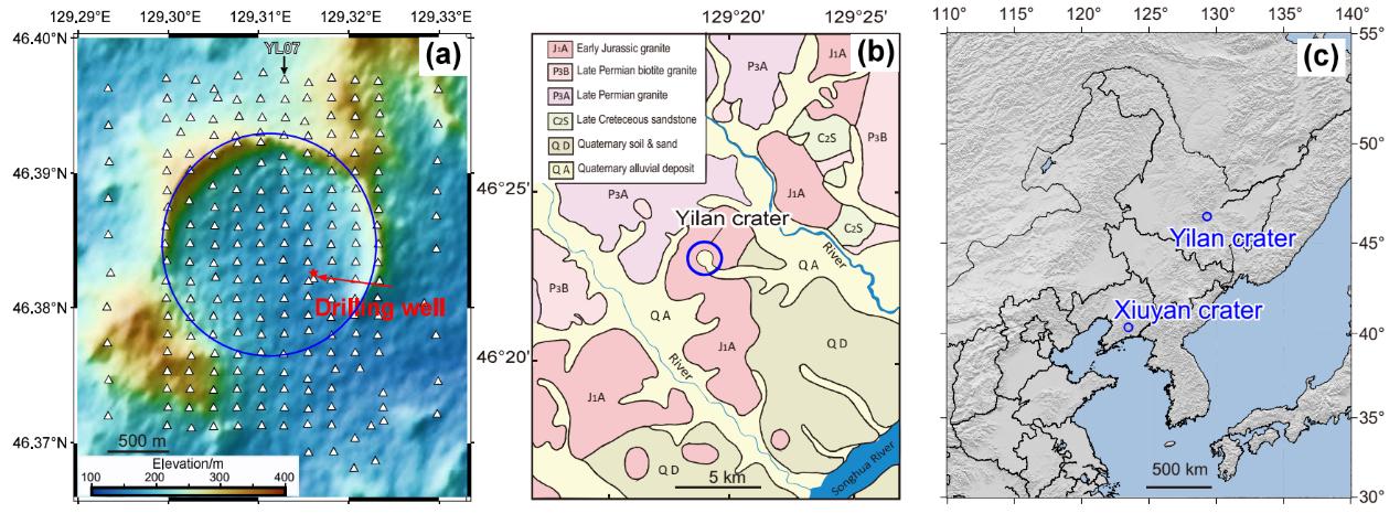 依兰陨石坑的位置、地质构造及密集地震台阵分布。研究团队供图