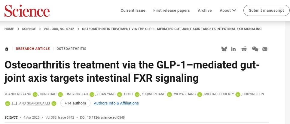 该成果近日在线发表于Science,湘雅医院教授雷光华、曾超、魏捷和上海药物研究所研究员谢岑为共同通讯作者,湘雅医院为论文第一单位和第一通讯单位。该研究彻底颠覆了骨关节炎就是关节磨损等局部因素所致疾病的传统认知,系统提出骨关节炎“肠-关节轴”发病机制新学说,并发现“熊去氧胆酸(UDCA)”有望老药新用治疗骨关节炎。