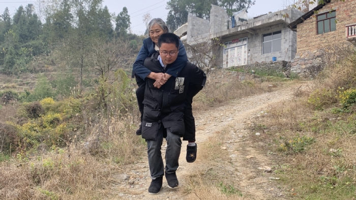 李嘉添背着行动不便的老人下山做检查。