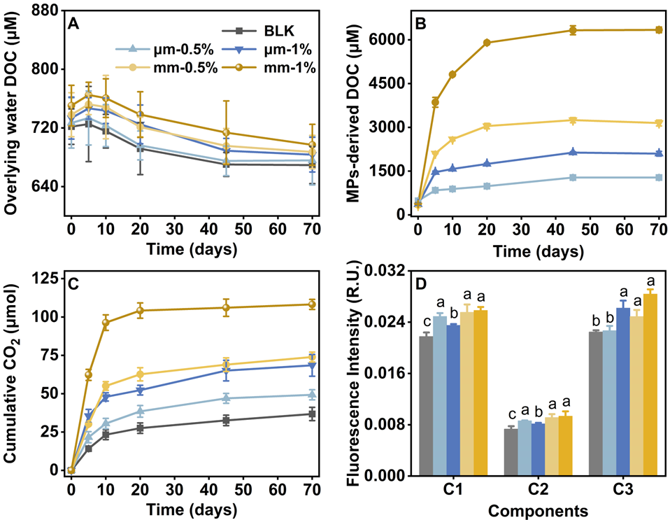 科研人员在国家自然科学基金等项目的资助下,以生物可降解的聚乳酸(PLA)微塑料为研究对象,设计了长达70天的厌氧微宇宙实验,系统探究了不同浓度的毫米级(mm-PLA)和微米级(μm-PLA)两种PLA微塑料对红树林沉积物硫酸盐还原及溶解性有机碳降解的影响,结合稳定硫同位素分析、三维荧光-平行因子分析、16S rRNA基因扩增子测序和宏基因组分析等多种技术手段,深入解析了碳-硫耦合循环微生物群落结构、功能基因及代谢网络对不同粒径微塑料的响应机制。