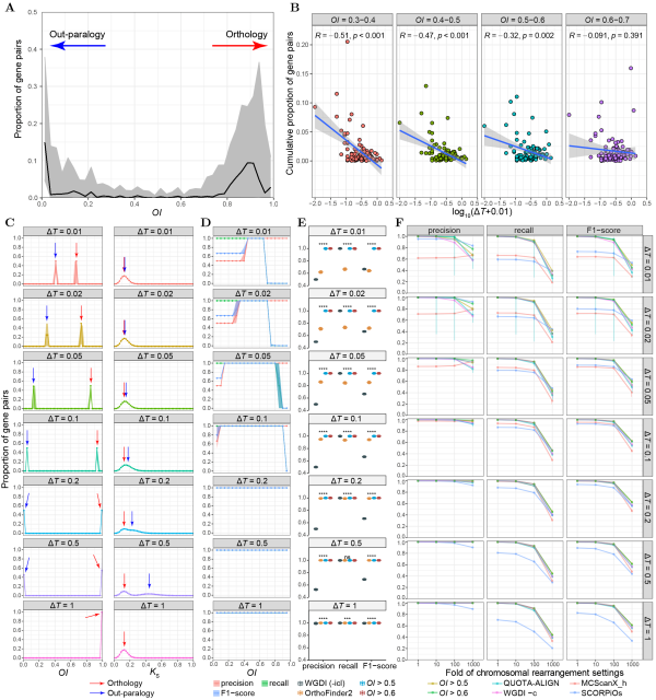 中国科学院昆明植物研究所研究员马永鹏团队联合国际、国内科研机构开发了直系同源指数(OI),以度量共线性的直系同源水平,其定义为种间共线性区块内直系同源基因的占比。理想状态下,直系/外旁系共线性的OI值分别趋近于1和0。实际分析表明,二者呈现两级分化的特征(高OI值 vs 低OI值),据此可有效区分两类共线性(图1)。通过对近百例真实植物基因组数据进行验证及利用模拟数据集进行基准测试,确认了OI方法在识别直系同源共线性上的稳健性和准确性。相较于传统KS分析及其他工具(如QUOTA-ALIGN、WGDI -c、MCScanX_h、SCORPiOs等),OI在WGD与物种分化时间间隔(ΔT)较小时展现出更高的准确度和稳健性(图2)。同时,研究团队构建了自动化分析工具SOI,支持共线性可视化、过滤及下游系统发育分析。