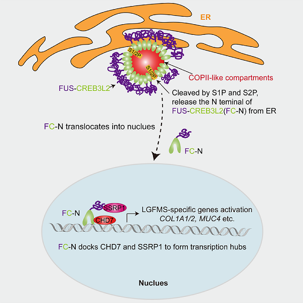 研究显示,在细胞核内,FC-N特异性募集SSRP1和CHD7形成转录复合物,激活低级别纤维黏液样肉瘤特征性基因表达,诱导细胞获得恶性表型。