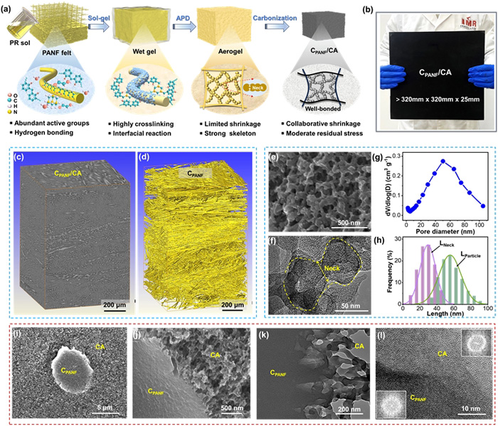 近年来,中国科学院金属研究所研究员汤素芳团队致力于碳气凝胶强韧性、抗氧化及大尺寸成型研究,取得了系列进展。该团队在前期工作的基础上,受天然生物材料多尺度复合和梯度过渡界面结构的启发,联合研究员刘增乾、张哲峰以及美国加州大学伯克利分校的研究人员提出了柔性有机纤维-有机气凝胶基体的协同界面调控策略,并研制出高强高损伤容限大尺寸碳气凝胶材料。