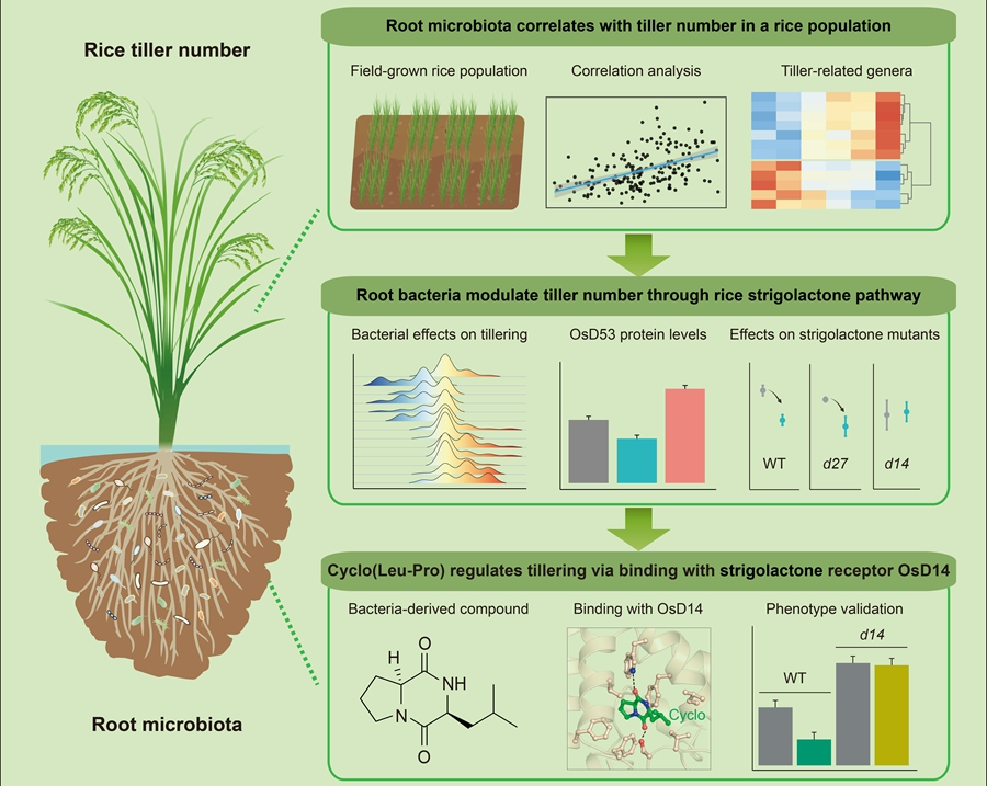 根际微生物组被誉为植物的第二基因组,在植物的生长发育与健康中发挥着关键作用。水稻作为全球近半人口的主粮作物,其产量直接影响粮食安全,而分蘖数是决定水稻产量的重要性状,受遗传和多种环境因子调控。长期以来,根际微生物群落是否参与及如何参与调控分蘖形成及其分子机制,一直是学界未解之谜。阐明这一问题,将为微生物在农业上的应用及作物绿色发展中具有重要的意义。