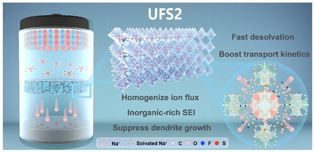该研究围绕钠金属电池中界面不稳定与离子迁移受限的挑战,提出并构建了双极性功能团(−F与−SO?H)协同修饰的UFS2@GF隔膜。该隔膜在结构层面实现了对钠离子脱溶剂化、迁移动力学以及成核行为的多重调控;在界面层面诱导形成富无机组分的稳定固体电解质界面膜,显著抑制枝晶生长与副反应,整体提升了电化学性能与循环稳定性。进一步,量化计算揭示了MOF骨架对Na?吸附与迁移路径的本征调控机制,为实验结果提供了理论支撑。