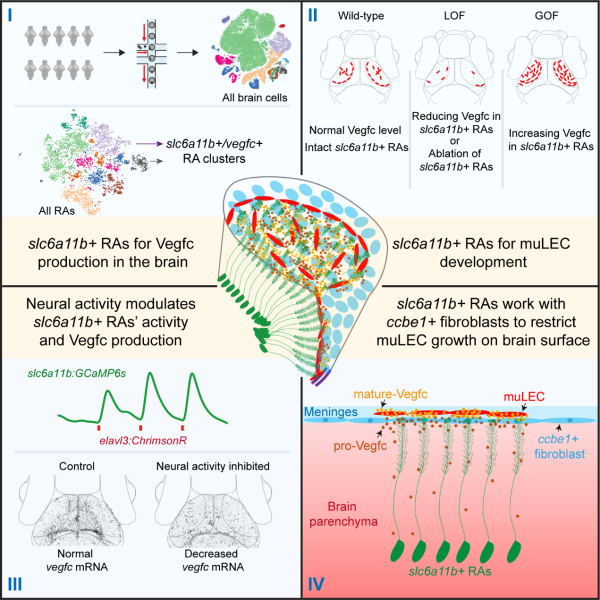 该团队利用脊椎动物斑马鱼在体长时间成像的优势,并结合多种基因操作、神经活动调控等手段发现,上调大脑神经活动如视觉诱发等显著增强位于软脑膜muLEC的发育,抑制神经活动如视觉剥夺等则导致muLEC发育受损。以淋巴系统发育所必需的因子Vegfc为线索,团队在脑内鉴定出特异性表达Vegfc的胶质细胞亚群——slc6a11b+ RAs。这些细胞延伸出纤维直达脑膜表面,是脑内Vegfc的主要来源,其缺失导致muLEC无法正常发育,而上调其Vegfc信号则显著增强muLEC发育。同时,slc6a11b+ RAs的活动及其Vegfc的表达水平均受到神经活动调节。团队进一步发现,slc6a11b+RAs分泌的Vegfc前体需要位于脑膜的成纤维细胞分泌的CCBE1的协同作用,方可转化为成熟形式的Vegfc(mVegfc);这种跨组织间的协作将mVegfc的分布精确限制在脑膜上,确保muLEC仅分布于脑表面,避免侵入脑实质。