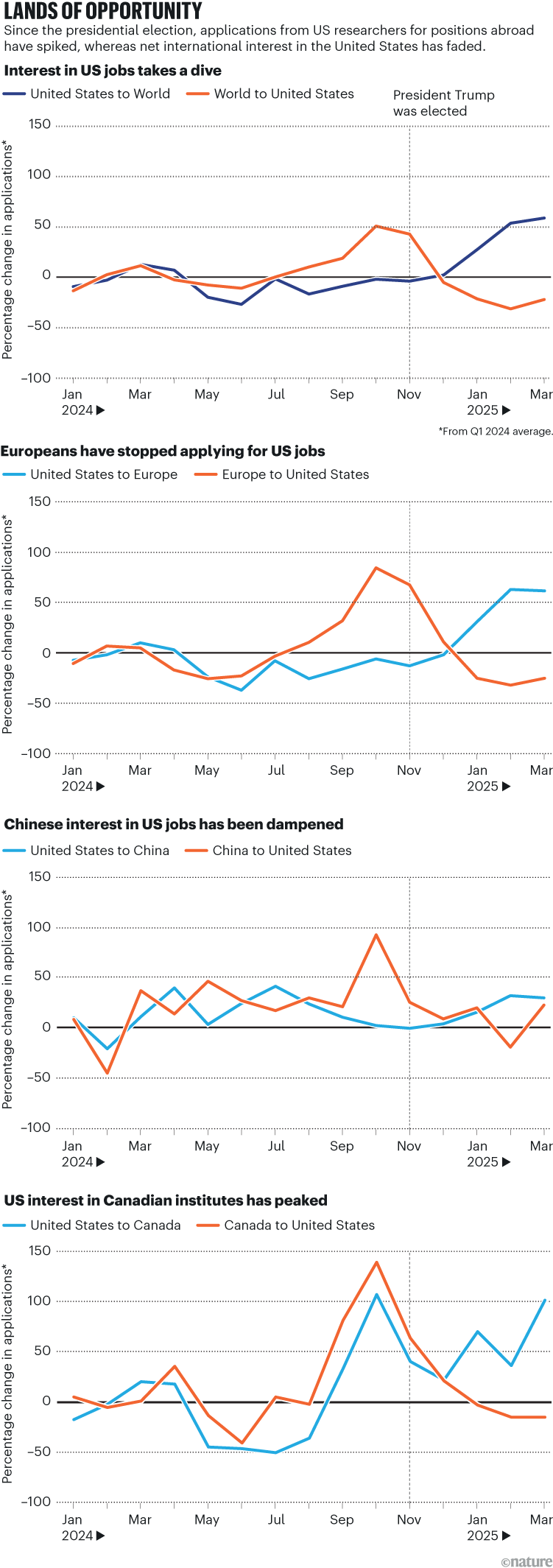2025年1月至3月,美国科学家对邻国加拿大职位的申请量比2024年同期增长41%。相比之下,加拿大研究人员对美国职位的申请量下降了13%。