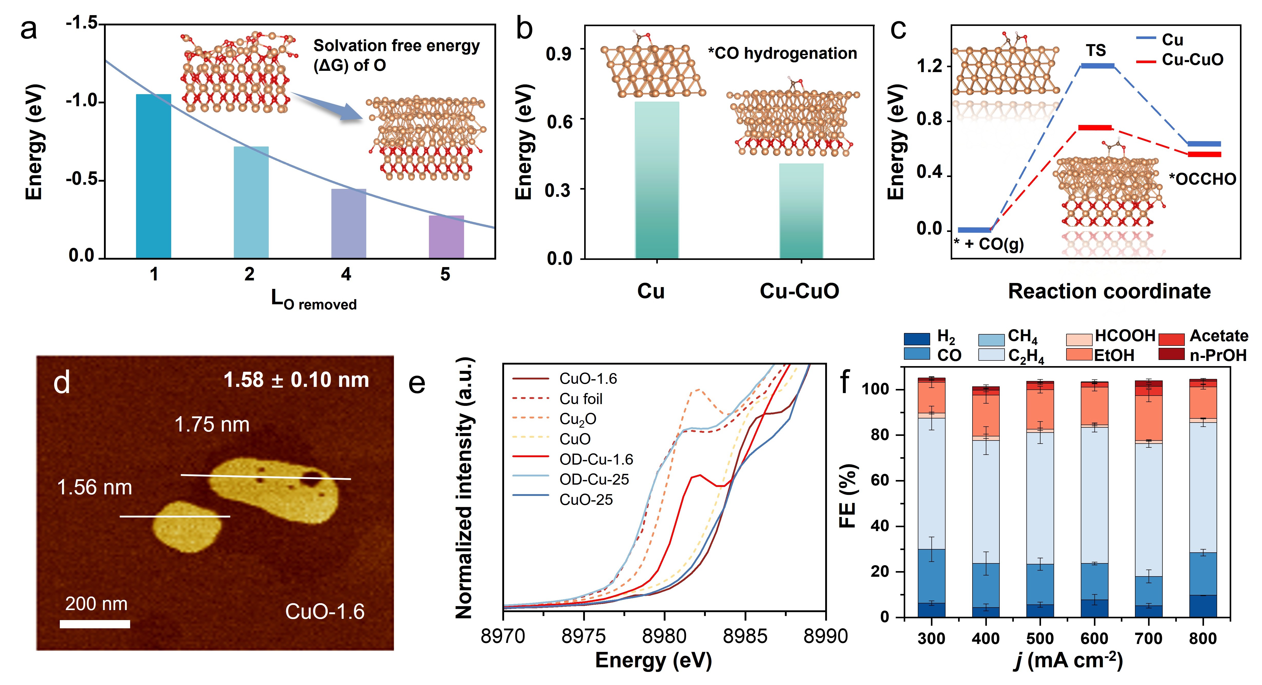 CuO预催化剂脱氧过程的理论模拟以及相应OD-Cu的反应路径计算,催化剂结构表征以及产物分布图。图片由研究团队提供