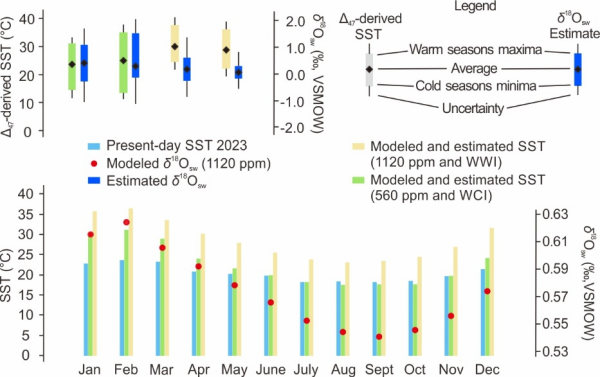 团簇同位素和模型重建的海表温度和δ18Osw 值的季节变化以及与现今海水观测特征