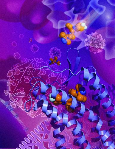 ①吴蓓丽团队通过解析蛋白质分子结构,揭示了HIV感染人体细胞的机制。图中紫色螺旋为CCR5蛋白分子,橘黄色和蓝色小球为马拉维诺,多面体为HIV。