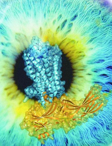 ②徐华强领衔的国际合作团队首次解析了视紫红质与阻遏蛋白完整复合物的晶体结构。图中蓝色所示为视紫红质的结构,黄色所示为阻遏蛋白的结构。上海药物所供图