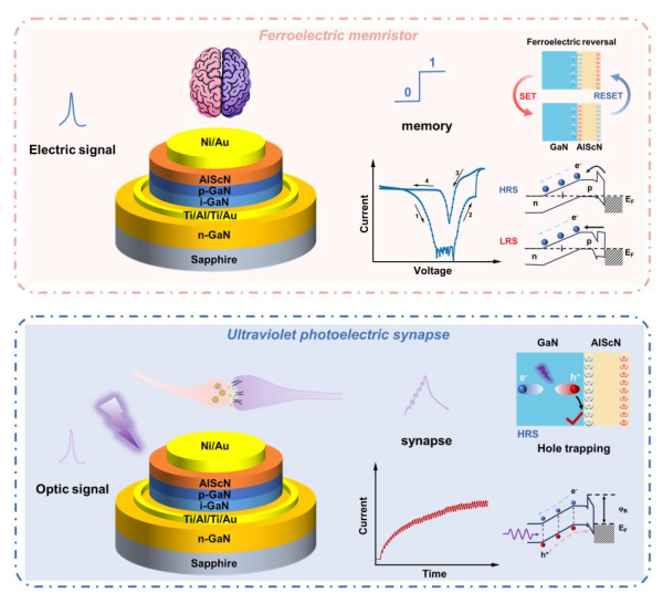 相关研究成果以Ultraviolet Optoelectronic Synapse Based on AlScN/p-i-n GaN Heterojunction for Advanced Artificial Vision Systems为题,发表在《先进材料》(Advanced Materials)上。