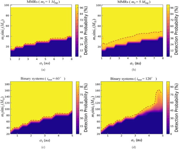 研究人员还利用N体模型计算了天体测量探测概率在平运动共振和长期共振机制下的变化,但由于轨道半长轴和行星质量均无显著变化 ,天体测量信号没有类似视向速度的明显漂移,Gaia的天体测量精度目前不足以探测到轨道动力学演化的微弱信号。未来,基于CHES与地基高精度视向速度光谱仪、直接成像法空间任务的协同观测,将显著提升近邻宜居系外行星的探测效率,提供行星系统的动力学约束,并更准确地刻画类地行星质量。