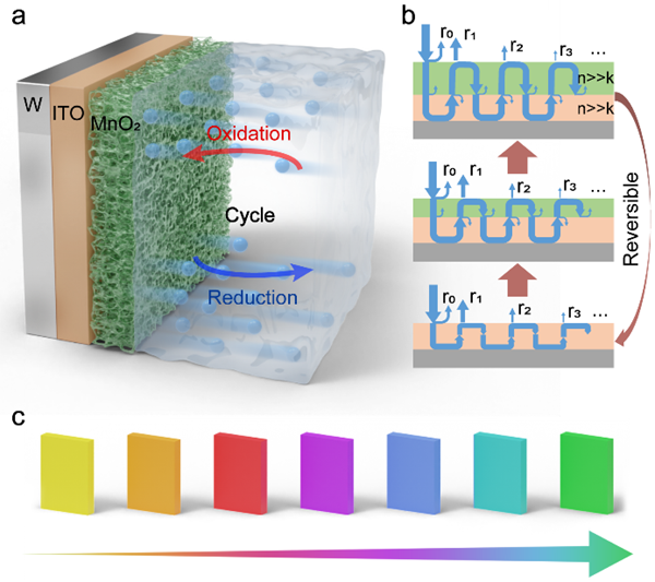 中国科学院苏州纳米技术与纳米仿生研究所研究员赵志刚团队通过电致变色电极表面的原位电驱动光学谐振腔重构技术,研制出具有宽谱可调特性的新型电致变色器件。该方法制备的器件可在单一器件中实现从黄色、橙色、红色、紫色、蓝色、青色到绿色等多种颜色转变,几乎覆盖整个可见光谱。除超宽色调可调性外,器件还具有工作电压窗口小、优异的双稳态保持性、极低功耗以及良好的循环稳定性等优点。