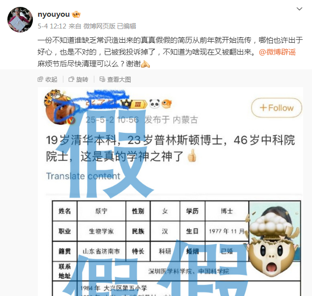 颜宁公开打假,为何总有人热衷于“造神”?。日前,面对一份网络流传的虚假简历,中国科学院院士、知名科学家颜宁公开发帖辟谣:“一份不知道谁(缺乏常识)造出来的真真假假的简历,从前年就开始流传,哪怕也许出于好心,也是不对的,已被我投诉(删)掉了,不知道为啥现在又被翻出来。”