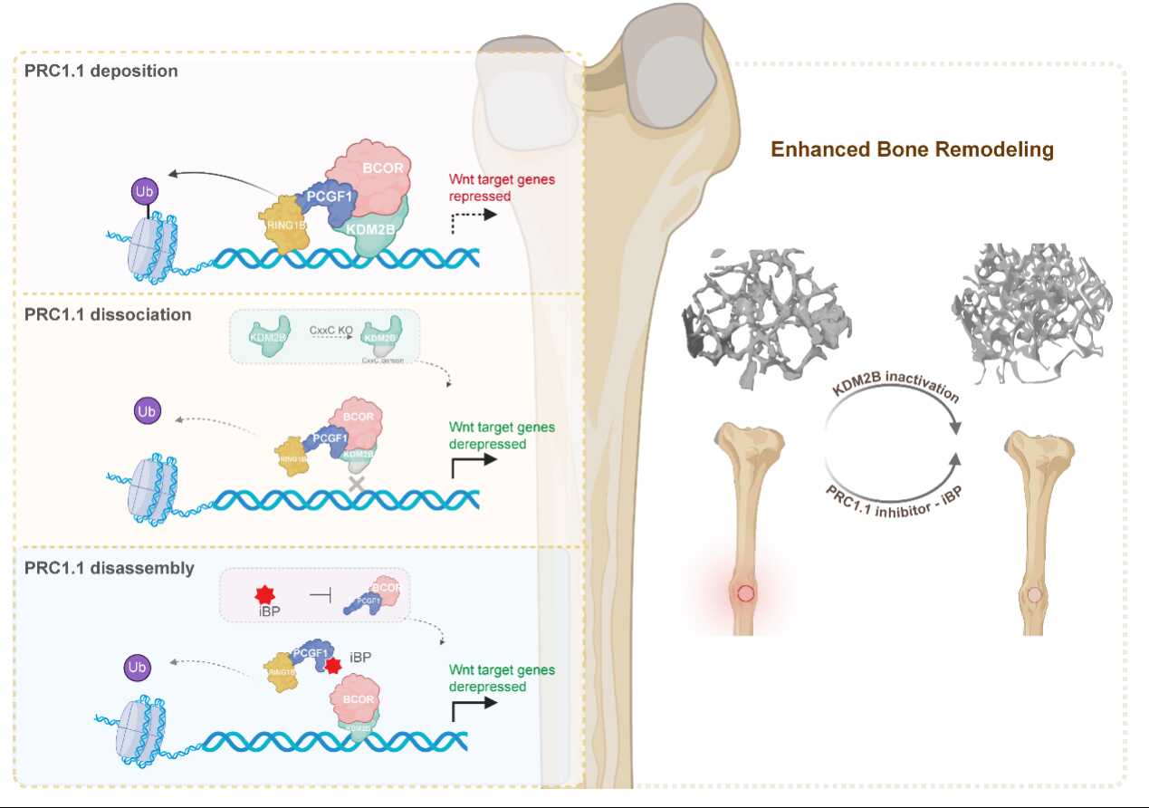 PRC1.1复合物是一种非典型多梳蛋白抑制复合物,由RING1B/PCGF1核心二聚体(具有E3泛素连接酶活性)及附属亚基KDM2B、BCOR等组成。BCOR与PCGF1的相互作用在复合物组装和功能发挥中具有关键作用。研究表明,PRC1.1功能增强与小鼠的成骨功能障碍密切相关,而KDM2B失活可显著下调PRC1.1催化的组蛋白H2AK119单泛素化(H2AK119ub1)水平,进而激活Wnt/β-catenin信号通路,促进骨重塑。