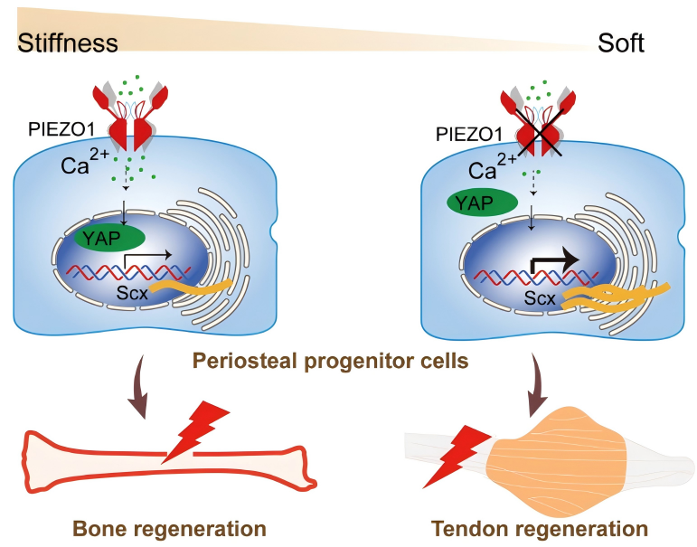 科学家发现骨外膜骨骼干祖细胞具有两种命运抉择。海南医科大学(海南省医学科学院)教授邹卫国、研究员王丽君团队合作,首次发现骨外膜骨骼干祖细胞具有成骨和成肌腱的两种命运抉择,其命运决定受到机械刺激敏感蛋白PIEZO1调控,并证明了力学刺激具有优化骨骼干祖细胞参与损伤修复的能力,为组织再生提供了新策略。相关研究近日发表于《细胞研究》。
