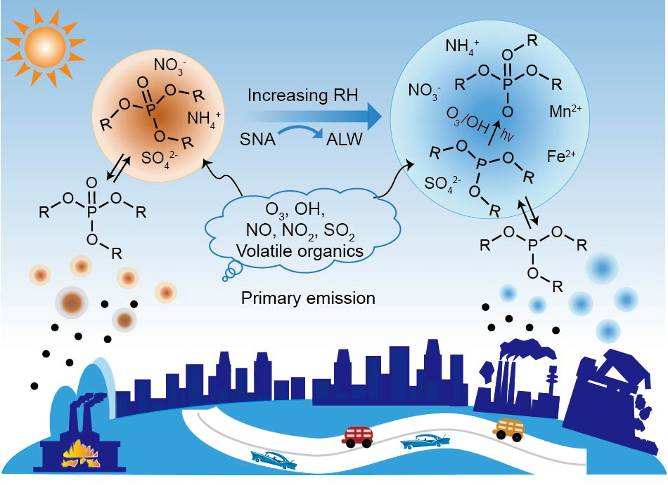 我们研究发现,大气中的亲水性有机磷酸酯既可来源于有机磷酸酯的直接排放,也可由其前体物——亚磷酸酯抗氧化剂,在颗粒物中经液相氧化而二次形成,且该机制在气溶胶液态水含量较高的冬季尤为显著。论文共同通讯作者张干指出,这一认识,首次强调了气溶胶液相过程在有机磷酸酯环境归趋中所起的重要作用。