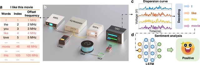 近日,华中科技大学光电学院唐明教授领导的研究团队,依托其在光纤通信领域的深厚研究基础,开发了一种新型的语义光纤通信系统,利用多模光纤的频率敏感性和模间色散特性,实现了语义信息的编解码和传输。该成果以Optical Semantic Communication through Multimode Fiber: From Symbol Transmission to Sentiment Analysis为题发表于国际顶尖光学期刊《Light: Science Applications》,华中科技大学博士生高正为该文第一作者,华中科技大学唐明教授和吴昊副研究员为通讯作者。