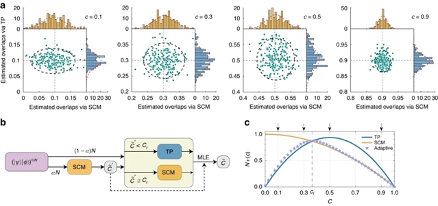 基于实验结果和理论分析,研究团队提出了一种自适应的重叠度估计方案,结合层析-投影(TP)和舒尔联合测量(SCM)方案的优势,实现了在全范围重叠度下逼近最优的估计精度。
