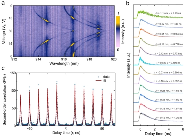 图2:(a)片上调控微腔耦合量子点单光子信号;(b)量子点荧光增强;(c)片上微腔增强量子点单光子纯度测试