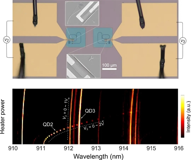 为展示该混合微腔增强确定性单光子源的片上扩展能力,研究团队在4H-SiC光子芯片上制备了两个量子点混合微腔,二者相距250 μm距离。为消除量子点由于生长导致的固有频率差异,研究团队分别对量子进行局域调谐,不仅实现了量子点与微腔模式的耦合,同时实现了不同微腔增强量子点单光子信号的频率匹配,为下一步实现片上不同节点的确定性单光子干涉,进而实现片上光量子比特互联奠定前期研究基础。