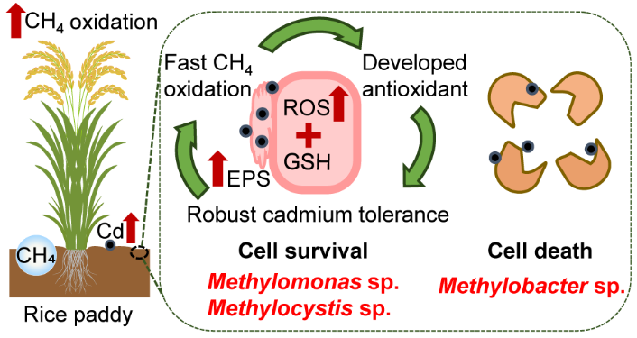 稻田土壤好氧甲烷氧化菌镉胁迫响应机制示意图。研究团队供图