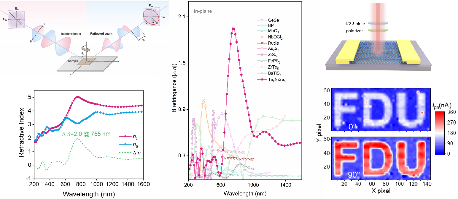 研究团队系统研究了准一维范德华晶体Ta2NiSe5的面内光学、电学与光电各向异性。系列实验测试结果显示,Ta2NiSe5在可见光至红外波段表现出高面内双折射,最大双折射值高达近2.0,为目前已知报道的最大的面内双折射范德华晶体材料。机制研究表明,Ta2NiSe5晶体的独特准一维结构与极化率强对比协同作用,共同促成了其强面内光学各向异性。