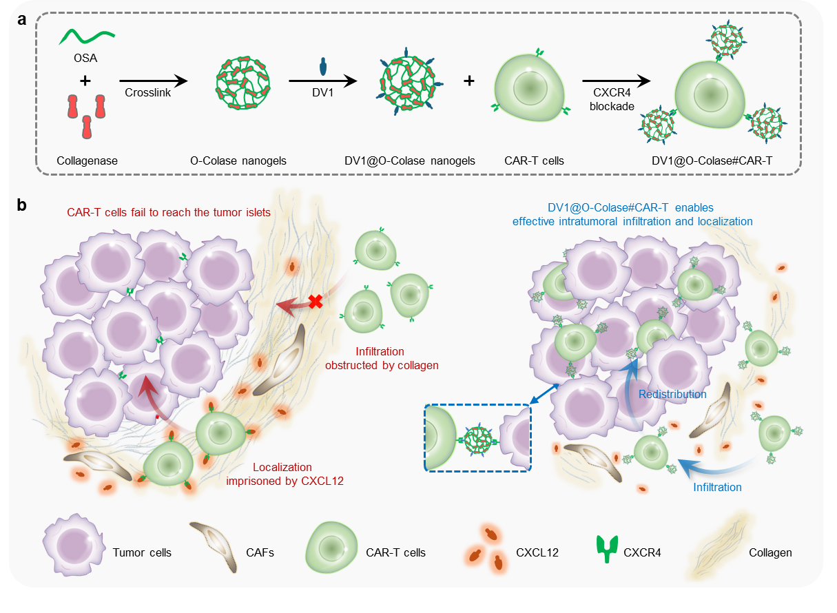 该研究中的纳米凝胶(DV1@O-Colase)通过化学交联胶原酶制备,并用CXCR4拮抗剂(DV1)修饰。这些纳米凝胶通过受体-配体相互作用与CAR-T细胞结合,形成CAR-T细胞结合的纳米凝胶背包递送系统(DV1@O-Colase#CAR-T)。该系统能够有效突破胶原蛋白丰富的细胞外基质,破坏趋化因子(CXCL12)介导的CAR-T细胞禁锢现象,从而增强CAR-T细胞在肿瘤中的浸润与定位,解决了其在实体肿瘤中的导航缺陷。研究表明,DV1@O-Colase#CAR-T显著提升了胰腺癌的治疗效果,浸润率相较于游离CAR-T细胞提升约5倍,能够有效消退肿瘤并延长小鼠生存期。