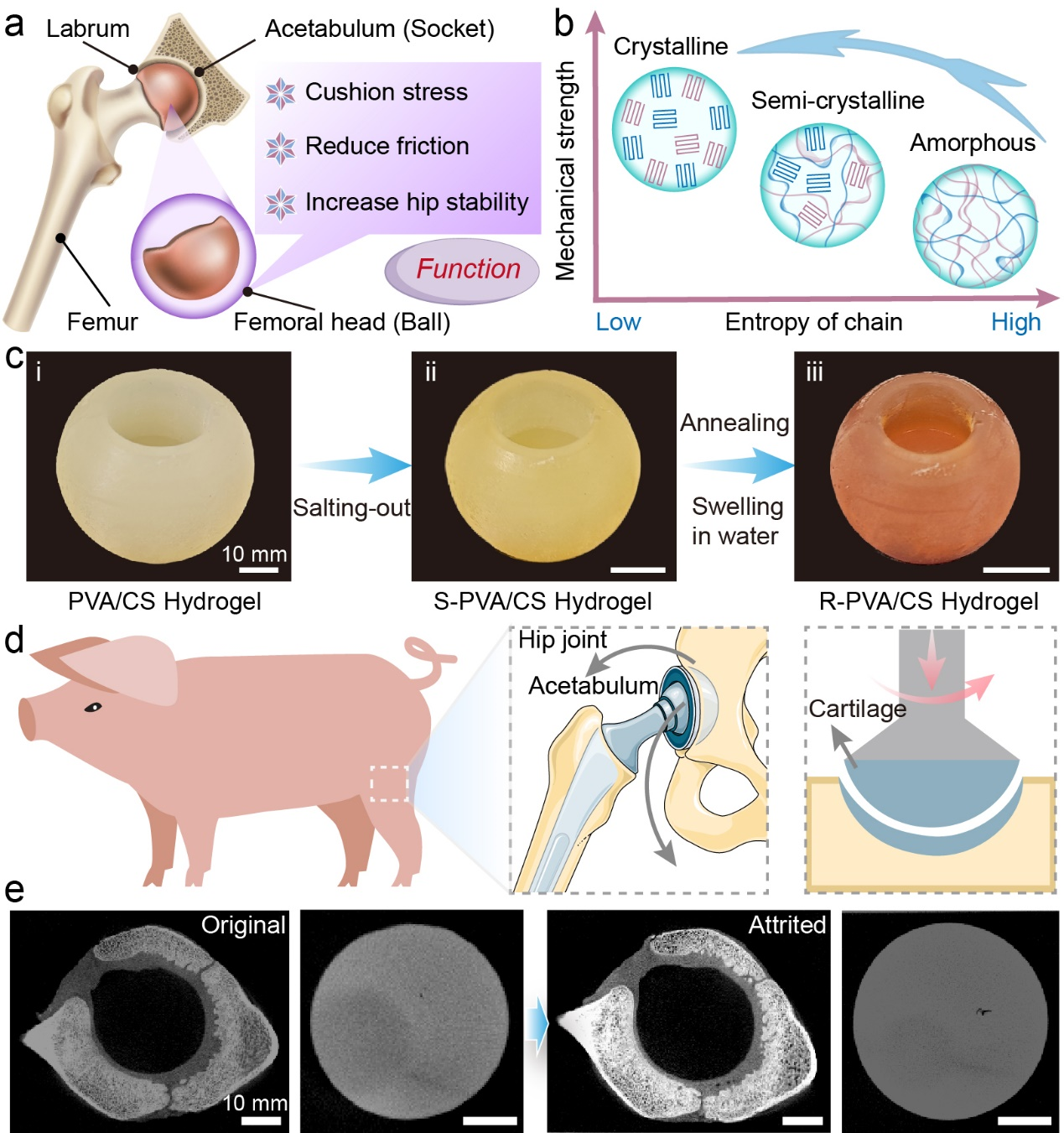 此外,研究还展示了PVA/CS水凝胶在模拟人体承重组织中优异的耐磨性,特别是在人工髋关节中的应用前景,为高性能人工关节润滑材料的研发提供了新思路。这一成果为关节修复和生物润滑领域带来了新的希望,有望让更多关节疾病患者受益。(来源:中国科学报 叶满山)