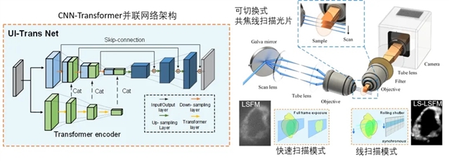 图1. CNN-Transformer并联网络架构 UI-Trans Net(左);可切换式共焦线扫描光片显微镜(右)。