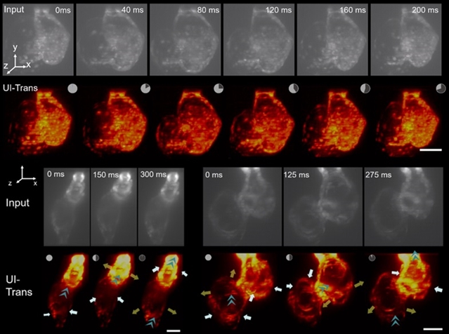 图3. 使用UI-Trans进行活体斑马鱼心脏影像恢复。48h.p.f. (上)、30h.p.f. (左下)和120 h.p.f.(右下)斑马鱼心脏跳动影像的不同时间点恢复前后对比图(灰色:恢复前,橙色:恢复后)。
