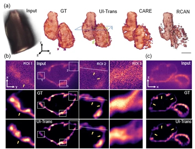 研究人员通过UI-Trans网络提高了体质量斑马鱼心脏图像的质量。图2中(a)和(b)展示了通过不同竞争网络恢复的三维斑马鱼心脏图像,其中UI-Trans网络经过多损失联合优化后,在离体斑马鱼心脏数据集中表现出更高的信噪比、更多的结构细节和更高的保真度,显著超越了其他网络。实验结果表明,UI-Trans在恢复心肌层的细微结构方面尤为出色,能够清晰地展示心肌细胞的分布。