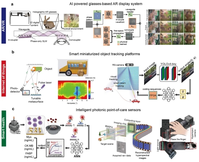 我们预计在不久的未来,人工智能技术与光子学的深度融合将催生颠覆性的技术与基础设施,重新塑造我们的日常生活。例如,在元宇宙的宏伟愿景中,智能光子学能够提供高吞吐量、无缝衔接的信息交互界面,在极为紧凑的系统中高效传输数字世界与现实世界之间的视觉内容。此外,随着高速网络的普及,物联网设备的互联互通将从这一融合中受益,进一步推动智能互联时代的发展。同时,纳米光子学与人工智能的协同进步,也将在医疗领域带来深远影响,特别是在早期智能诊断方面,有望实现更精准、高效的健康监测和疾病预测,为未来医疗系统奠定坚实基础。从元宇宙,物联网到智慧医疗,智能光子学系统将为这些前沿领域提供更加强有力的技术支撑。