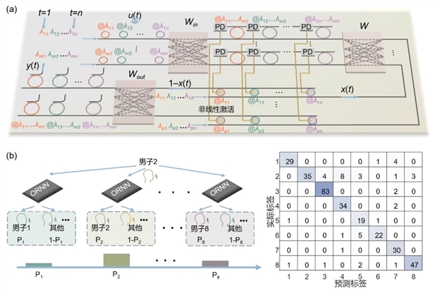 图3:(a) ORNN 计算流程示意图,展示波长复用和非线性计算的实现方式。(b)语音分类实验结果,展示了一对多的训练策略和八分类混淆矩阵