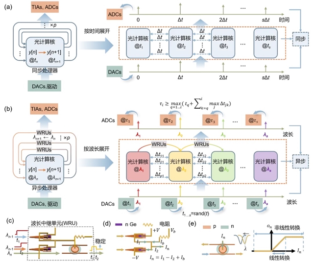 基于时间序列的光学循环计算要求光信号严格时序对齐,并且多路数据信号周期和光学延迟之间需要保持严格一致,如图1(a)所示。为了解决上述同步难题,研究团队提出了一种基于波长编码的异步计算架构。在该架构中,不同时间循环周期的数据被映射到不同的波长通道,并通过片上波长中继单元(WRU)完成数据传递,如图1(b)所示。相比传统的时序同步方法,该方案无需精确对齐不同计算单元的数据传输时间,从而减少了同步电路的功耗,简化了系统设计。该架构通过光学计算核心执行波长复用的矩阵运算,并结合光电探测器驱动的微环调制器(即波长中继单元)完成信号在波长域的转换,使计算完全在光域中进行。其中,微环调制器采用下一级波长官员作为补充光,结合其传递函数的性质,波长中继单元(WRU)可以实现信号之间的加、减、乘、除、非线性等多种计算功能,如图1(c-e)所示。