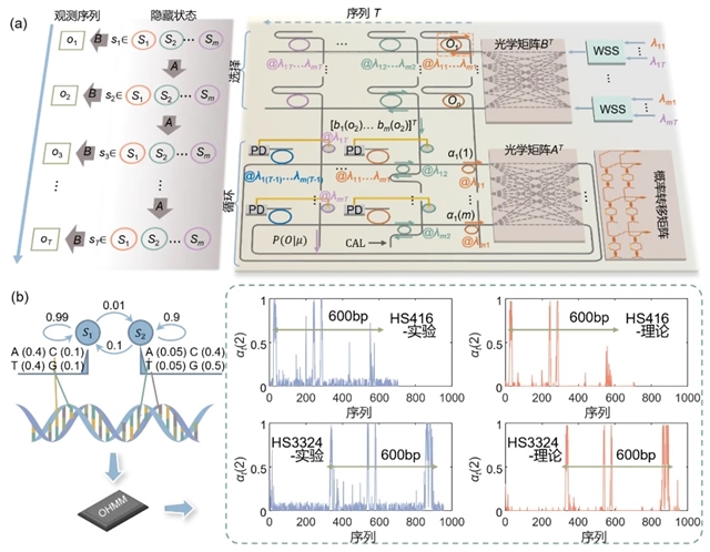图2:(a) OHMM 计算流程示意图,展示光学矩阵计算如何用于隐藏状态推理。(b)芯片在DNA序列分析中的应用。图中展示了实验结果与理论计算的对比