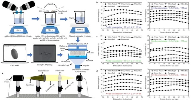 研究团队利用DLP打印技术,通过将含有特定浓度的光致变色粉末混合进树脂中,实现了精准控制透镜几何形状和光学性能。该树脂配方包含甲基丙烯酸2-羟乙酯(HEMA)、聚乙二醇二丙烯酸酯(PEGDA)和三甲基苯甲酰基二苯基氧化膦(TPO)分别作为单体、交联剂和光引发剂,再添加以光致变色粉末。当光致变色粉末受到紫外线辐射时,其经历可逆的异构化过程,使得光学性能发生改变。最终发现光致变色粉末浓度为0.1% wt和0.2% wt的配方能够在420 nm ~700 nm波段实现70 ~ 85%的透光率,而在紫外线照射下,所有透镜组在5 ~10秒内转变为有色状态,对400 nm附近波段的透光率从40%降到20%,真正实现了4D打印菲涅尔透镜的动态光学性能。