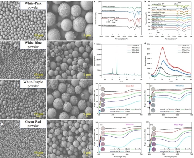 研究人员通过在透镜中采用不同类型和浓度的螺吡喃染料,实现了对透镜光谱特性的自由定制。实验中,研究人员将5SP(吲哚啉螺萘吡喃)和6SP(具有6-硝基取代的吲哚啉螺苯并吡喃)光致变色粉末与树脂混合,调节其浓度。所使用的粉红色和红色粉末可以分别被识别为5SP和6SP染料。与6SP染料相比,5SP染料表现出明显更快的反向光致变色速率,导致后者的更显著的光致变色强度。对于高极性溶剂,5SP染料在约560-610 nm处表现出最大吸收,而6SP染料在530-560 nm处具有最大峰值吸收。FTIR与XDR结果显示,利用此材料配方制备的透镜能够成功聚合并且具有无定形性质。同时,不同粉末组合和浓度的透镜具有不同的特征峰位,观察透镜在紫外光照射下的颜色变化和透光率,不同透镜对不同波段的光线具有一定的吸收特性,能够满足特定的滤光需求。