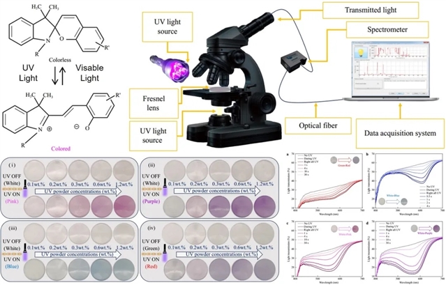 光致变色粉末通常含有中心物质,如螺吡喃(spiropyran),包裹在三聚氰胺甲醛(melamine formaldehyde)树脂中以获得稳定性。螺吡喃分子在无紫外光照射时,处于闭环的非共轭结构,呈现无色或浅色;当受到紫外光照射时,螺吡喃分子经历开环异构化,转变为具有共轭结构的甲亚胺(merocyanine)形式,这一变化使得分子对可见光的吸收特性发生改变,通常表现为颜色加深;在去除紫外光照射后,Merocyanine形式会逐渐回转为原始的螺吡喃形式,颜色恢复到无色或浅色状态。在实验中,研究人员将不同浓度的光致变色粉末添加到树脂中,通过精确控制粉末的种类和浓度,调节透镜在紫外光照射下的颜色变化程度和透光率。团队制备的菲涅尔透镜在紫外光(375 nm,1600流明)激活下,能够迅速改变颜色和透光性能,表现出优异的动态光学调控能力。测试结果显示,这些透镜在紫外激活后,颜色变化明显,例如从白色变为蓝色、紫色等,同时能够有效阻挡紫外线和蓝光。
